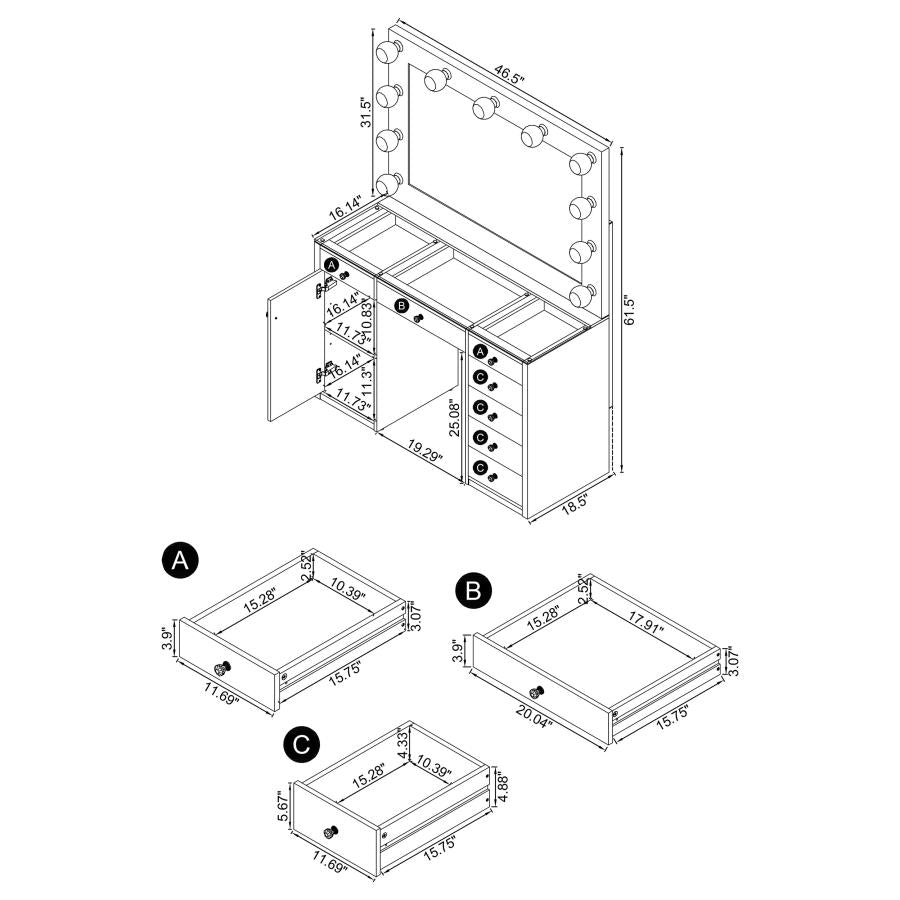 The epitome of Hollywood glam, this vanity will be the perfect upgrade for any home. Modern white finish matched fantastically with crystal knobs. Features seven drawers with full extension glides and a storage cabinet with an adjustable shelf. Clear tempered glass top allowing you to showcase your accessories. Mirror features eleven light sockets for a superior all-around even lighting (light bulbs included). Constructed with MDF, particle board, glass, and engineered laminate
