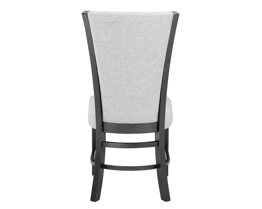 This sleek and modern dining group bridges form and function. The sculptural dining table has a sturdy base and the glass top allows views of the glitter upholstered open shelf. Streamlined chairs and bench feature pewter finished wood and crisp light gray upholstery.This 5-Piece Dinette Set includes 4 upholstered chairs and a small, round table.