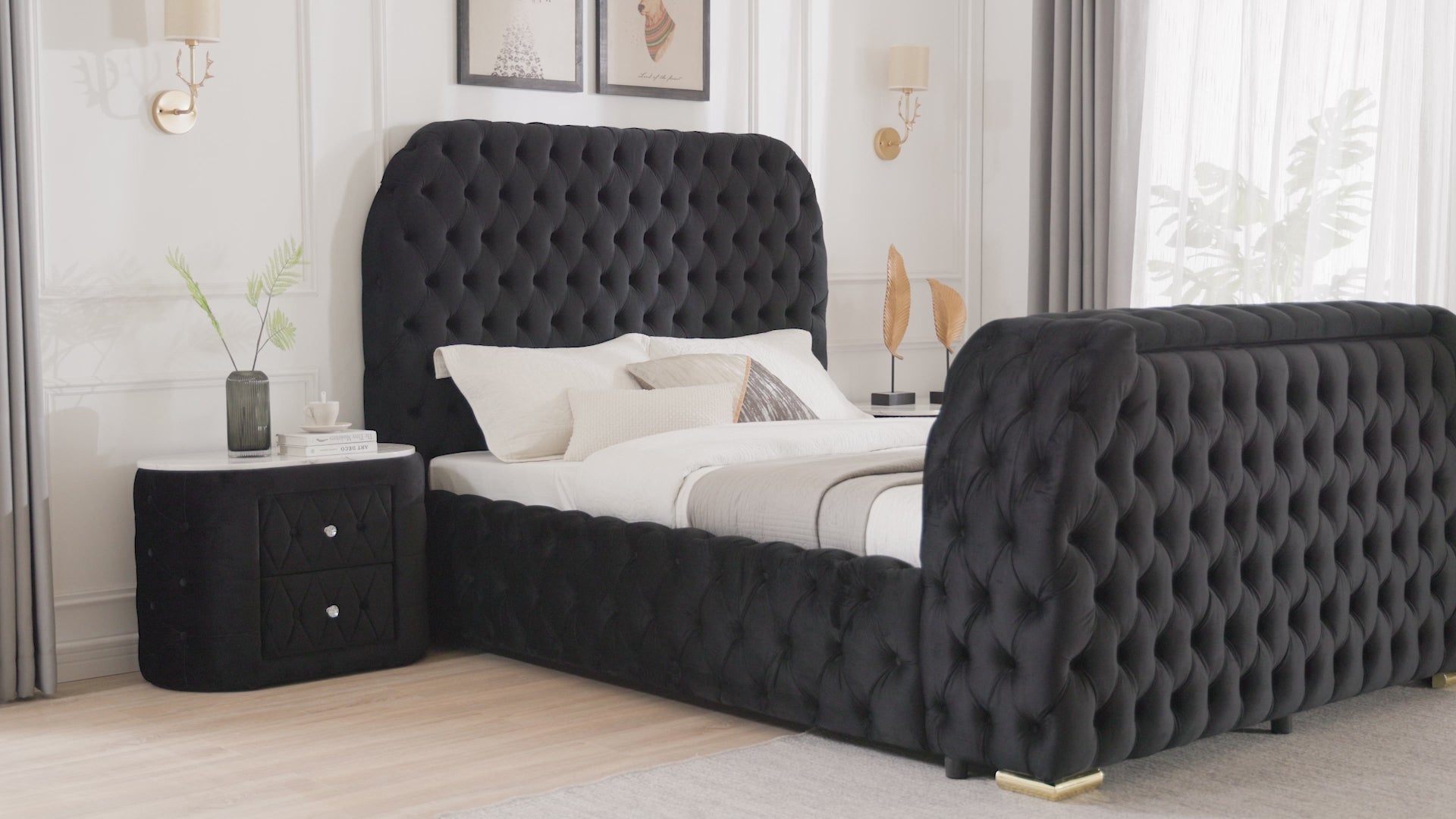 Indulge in the epitome of luxurious comfort and innovative design with this exquisite bed, a true masterpiece for those who appreciate both form and functionality in their sleeping quarters. Boasting a majestic, deeply tufted headboard that extends all the way to the edges, this bed is upholstered in sumptuous black velvet, offering a touch of opulence to any bedroom setting. The footboard features an integrated television lift mechanism, seamlessly blending entertainment with relaxation. Additionally, a built-in electric fireplace enhances the ambiance and provides a cozy, warm glow that invites you to unwind in style. The design is completed with subtle gold accents on the feet, adding a dash of elegance. This bed is perfect for those seeking a luxurious retreat that combines modern technology with sophisticated design elements to create an unparalleled bedroom experience.