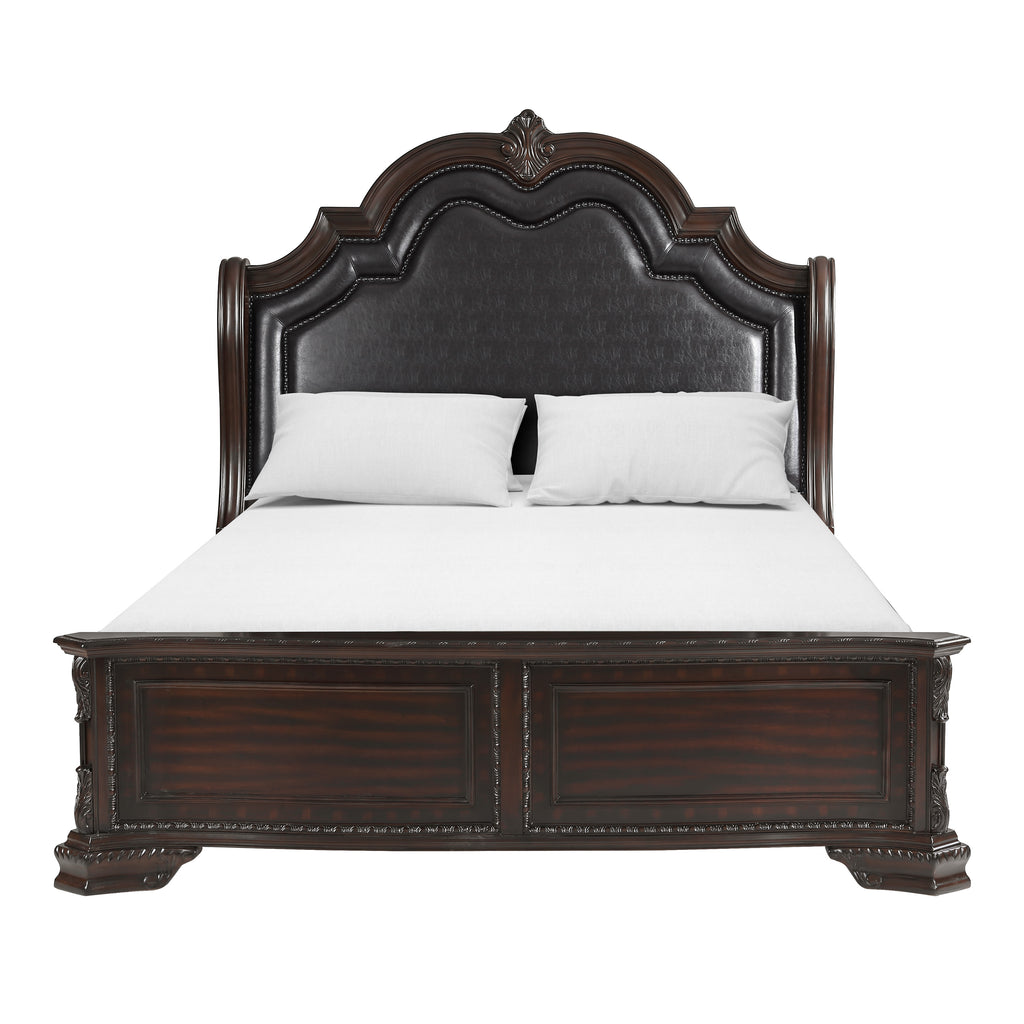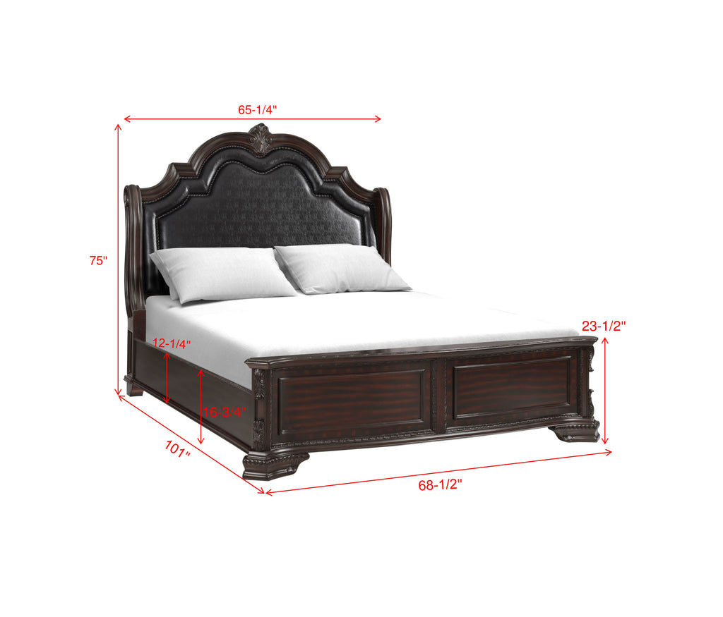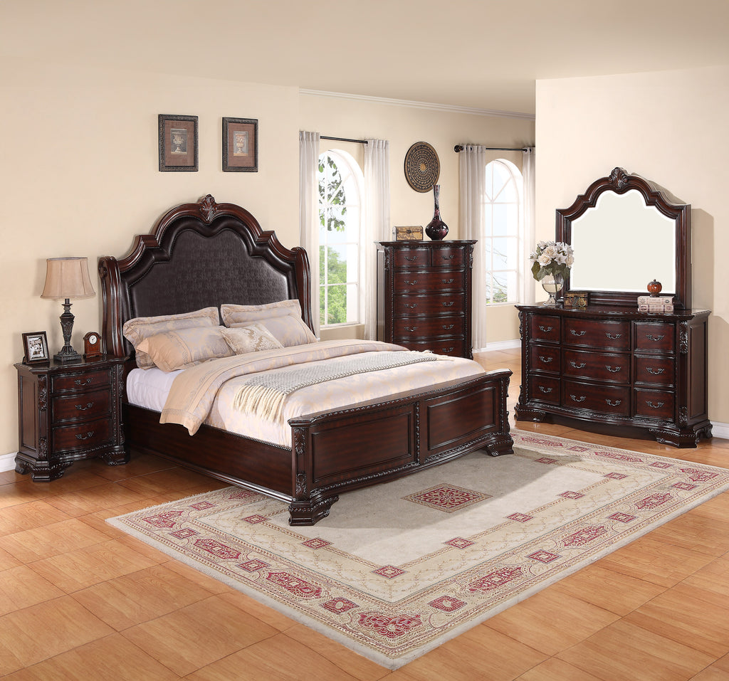 Full extension ball bearing glides French dovetail drawer front, English dovetail back Dustproof bottoms Faux leather upholstered headboard Beveled and shaped mirror Cord management on night stand